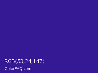 RGB 53,24,147 Color is a normal indigo color and the nearest color is Blue Gem #2c0e8c. Hex code #351893 and RGB value is rgb(53,24,147). In RGB color space, this color is composed of 21% red, 9% green, 58% blue, In CMYK color space, this color is composed of 64% cyan, 84% magenta, 0% yellow , 42% black , In HSL color space, this color has a hue angle of 254° , 72% saturation and 34% lightness.