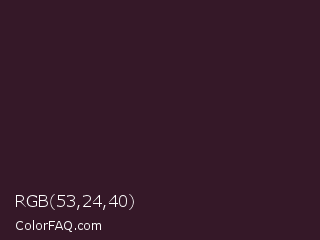 RGB 53,24,40 Color is a very dark magenta color and the nearest color is Jon #3b1f1f. Hex code #351828 and RGB value is rgb(53,24,40). In RGB color space, this color is composed of 21% red, 9% green, 16% blue, In CMYK color space, this color is composed of 0% cyan, 55% magenta, 25% yellow , 79% black , In HSL color space, this color has a hue angle of 327° , 38% saturation and 15% lightness.