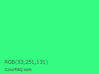 RGB 53,251,131 Color is a normal green color and the nearest color is UFO Green #3cd070. Hex code #35fb83 and RGB value is rgb(53,251,131). In RGB color space, this color is composed of 21% red, 98% green, 51% blue, In CMYK color space, this color is composed of 79% cyan, 0% magenta, 48% yellow , 2% black , In HSL color space, this color has a hue angle of 144° , 96% saturation and 60% lightness.