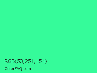 RGB 53,251,154 Color is a normal green color and the nearest color is Eucalyptus #44d7a8. Hex code #35fb9a and RGB value is rgb(53,251,154). In RGB color space, this color is composed of 21% red, 98% green, 60% blue, In CMYK color space, this color is composed of 79% cyan, 0% magenta, 39% yellow , 2% black , In HSL color space, this color has a hue angle of 151° , 96% saturation and 60% lightness.