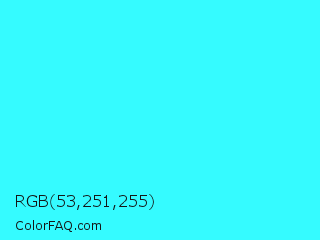 RGB 53,251,255 Color is a normal cyan color and the nearest color is Loeen #15f2fd. Hex code #35fbff and RGB value is rgb(53,251,255). In RGB color space, this color is composed of 21% red, 98% green, 100% blue, In CMYK color space, this color is composed of 79% cyan, 2% magenta, 0% yellow , 0% black , In HSL color space, this color has a hue angle of 181° , 100% saturation and 60% lightness.