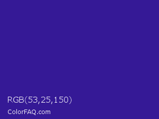RGB 53,25,150 Color is a normal indigo color and the nearest color is Blue Gem #2c0e8c. Hex code #351996 and RGB value is rgb(53,25,150). In RGB color space, this color is composed of 21% red, 10% green, 59% blue, In CMYK color space, this color is composed of 65% cyan, 83% magenta, 0% yellow , 41% black , In HSL color space, this color has a hue angle of 253° , 71% saturation and 34% lightness.