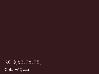 RGB 53,25,28 Color is a very dark red color and the nearest color is Eclipse #311c17. Hex code #35191c and RGB value is rgb(53,25,28). In RGB color space, this color is composed of 21% red, 10% green, 11% blue, In CMYK color space, this color is composed of 0% cyan, 53% magenta, 47% yellow , 79% black , In HSL color space, this color has a hue angle of 354° , 36% saturation and 15% lightness.