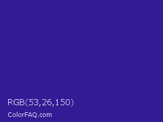 RGB 53,26,150 Color is a normal indigo color and the nearest color is Blue Gem #2c0e8c. Hex code #351a96 and RGB value is rgb(53,26,150). In RGB color space, this color is composed of 21% red, 10% green, 59% blue, In CMYK color space, this color is composed of 65% cyan, 83% magenta, 0% yellow , 41% black , In HSL color space, this color has a hue angle of 253° , 70% saturation and 35% lightness.