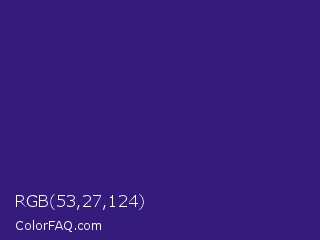 RGB 53,27,124 Color is a dark indigo color and the nearest color is Persian Indigo #32127a. Hex code #351b7c and RGB value is rgb(53,27,124). In RGB color space, this color is composed of 21% red, 11% green, 49% blue, In CMYK color space, this color is composed of 57% cyan, 78% magenta, 0% yellow , 51% black , In HSL color space, this color has a hue angle of 256° , 64% saturation and 30% lightness.