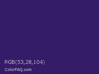 RGB 53,28,104 Color is a dark indigo color and the nearest color is Jacarta #3a2a6a. Hex code #351c68 and RGB value is rgb(53,28,104). In RGB color space, this color is composed of 21% red, 11% green, 41% blue, In CMYK color space, this color is composed of 49% cyan, 73% magenta, 0% yellow , 59% black , In HSL color space, this color has a hue angle of 260° , 58% saturation and 26% lightness.