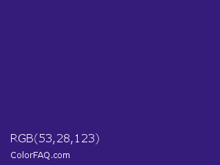 RGB 53,28,123 Color is a dark indigo color and the nearest color is Meteorite #3c1f76. Hex code #351c7b and RGB value is rgb(53,28,123). In RGB color space, this color is composed of 21% red, 11% green, 48% blue, In CMYK color space, this color is composed of 57% cyan, 77% magenta, 0% yellow , 52% black , In HSL color space, this color has a hue angle of 256° , 63% saturation and 30% lightness.