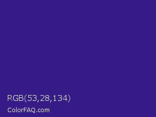 RGB 53,28,134 Color is a normal indigo color and the nearest color is Pixie Powder #391285. Hex code #351c86 and RGB value is rgb(53,28,134). In RGB color space, this color is composed of 21% red, 11% green, 53% blue, In CMYK color space, this color is composed of 60% cyan, 79% magenta, 0% yellow , 47% black , In HSL color space, this color has a hue angle of 254° , 65% saturation and 32% lightness.