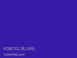 RGB 53,28,169 Color is a normal indigo color and the nearest color is Blue Pigment #333399. Hex code #351ca9 and RGB value is rgb(53,28,169). In RGB color space, this color is composed of 21% red, 11% green, 66% blue, In CMYK color space, this color is composed of 69% cyan, 83% magenta, 0% yellow , 34% black , In HSL color space, this color has a hue angle of 251° , 72% saturation and 39% lightness.