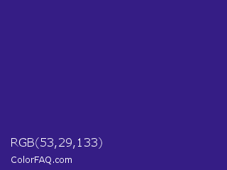 RGB 53,29,133 Color is a normal indigo color and the nearest color is Pixie Powder #391285. Hex code #351d85 and RGB value is rgb(53,29,133). In RGB color space, this color is composed of 21% red, 11% green, 52% blue, In CMYK color space, this color is composed of 60% cyan, 78% magenta, 0% yellow , 48% black , In HSL color space, this color has a hue angle of 254° , 64% saturation and 32% lightness.