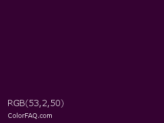 RGB 53,2,50 Color is a very dark magenta color and the nearest color is Mardi Gras #350036. Hex code #350232 and RGB value is rgb(53,2,50). In RGB color space, this color is composed of 21% red, 1% green, 20% blue, In CMYK color space, this color is composed of 0% cyan, 96% magenta, 6% yellow , 79% black , In HSL color space, this color has a hue angle of 304° , 93% saturation and 11% lightness.