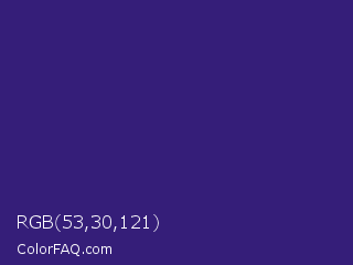 RGB 53,30,121 Color is a dark indigo color and the nearest color is Meteorite #3c1f76. Hex code #351e79 and RGB value is rgb(53,30,121). In RGB color space, this color is composed of 21% red, 12% green, 47% blue, In CMYK color space, this color is composed of 56% cyan, 75% magenta, 0% yellow , 53% black , In HSL color space, this color has a hue angle of 255° , 60% saturation and 30% lightness.