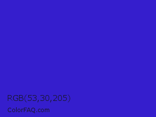 RGB 53,30,205 Color is a normal indigo color and the nearest color is Interdimensional Blue #360ccc. Hex code #351ecd and RGB value is rgb(53,30,205). In RGB color space, this color is composed of 21% red, 12% green, 80% blue, In CMYK color space, this color is composed of 74% cyan, 85% magenta, 0% yellow , 20% black , In HSL color space, this color has a hue angle of 248° , 74% saturation and 46% lightness.