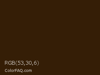 RGB 53,30,6 Color is a very dark orange color and the nearest color is Clinker #371d09. Hex code #351e06 and RGB value is rgb(53,30,6). In RGB color space, this color is composed of 21% red, 12% green, 2% blue, In CMYK color space, this color is composed of 0% cyan, 43% magenta, 89% yellow , 79% black , In HSL color space, this color has a hue angle of 31° , 80% saturation and 12% lightness.