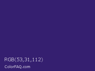 RGB 53,31,112 Color is a dark indigo color and the nearest color is Meteorite #3c1f76. Hex code #351f70 and RGB value is rgb(53,31,112). In RGB color space, this color is composed of 21% red, 12% green, 44% blue, In CMYK color space, this color is composed of 53% cyan, 72% magenta, 0% yellow , 56% black , In HSL color space, this color has a hue angle of 256° , 57% saturation and 28% lightness.