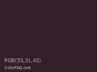 RGB 53,31,43 Color is a very dark magenta color and the nearest color is Thunder #33292f. Hex code #351f2b and RGB value is rgb(53,31,43). In RGB color space, this color is composed of 21% red, 12% green, 17% blue, In CMYK color space, this color is composed of 0% cyan, 42% magenta, 19% yellow , 79% black , In HSL color space, this color has a hue angle of 327° , 26% saturation and 16% lightness.