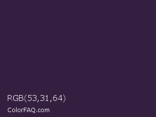 RGB 53,31,64 Color is a very dark purple color and the nearest color is Blackcurrant #32293a. Hex code #351f40 and RGB value is rgb(53,31,64). In RGB color space, this color is composed of 21% red, 12% green, 25% blue, In CMYK color space, this color is composed of 17% cyan, 52% magenta, 0% yellow , 75% black , In HSL color space, this color has a hue angle of 280° , 35% saturation and 19% lightness.