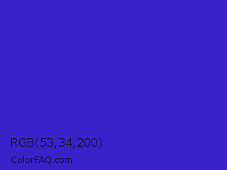 RGB 53,34,200 Color is a normal indigo color and the nearest color is Interdimensional Blue #360ccc. Hex code #3522c8 and RGB value is rgb(53,34,200). In RGB color space, this color is composed of 21% red, 13% green, 78% blue, In CMYK color space, this color is composed of 74% cyan, 83% magenta, 0% yellow , 22% black , In HSL color space, this color has a hue angle of 247° , 71% saturation and 46% lightness.