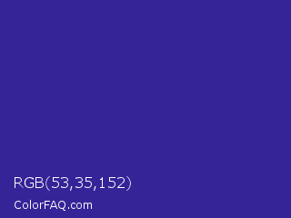 RGB 53,35,152 Color is a normal indigo color and the nearest color is Blue Pigment #333399. Hex code #352398 and RGB value is rgb(53,35,152). In RGB color space, this color is composed of 21% red, 14% green, 60% blue, In CMYK color space, this color is composed of 65% cyan, 77% magenta, 0% yellow , 40% black , In HSL color space, this color has a hue angle of 249° , 63% saturation and 37% lightness.