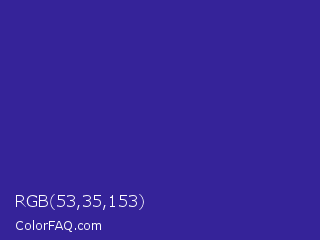RGB 53,35,153 Color is a normal indigo color and the nearest color is Blue Pigment #333399. Hex code #352399 and RGB value is rgb(53,35,153). In RGB color space, this color is composed of 21% red, 14% green, 60% blue, In CMYK color space, this color is composed of 65% cyan, 77% magenta, 0% yellow , 40% black , In HSL color space, this color has a hue angle of 249° , 63% saturation and 37% lightness.