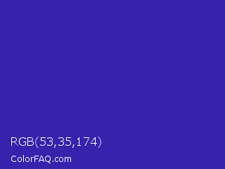 RGB 53,35,174 Color is a normal indigo color and the nearest color is Governor Bay #2f3cb3. Hex code #3523ae and RGB value is rgb(53,35,174). In RGB color space, this color is composed of 21% red, 14% green, 68% blue, In CMYK color space, this color is composed of 70% cyan, 80% magenta, 0% yellow , 32% black , In HSL color space, this color has a hue angle of 248° , 67% saturation and 41% lightness.