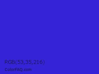RGB 53,35,216 Color is a normal indigo color and the nearest color is Interdimensional Blue #360ccc. Hex code #3523d8 and RGB value is rgb(53,35,216). In RGB color space, this color is composed of 21% red, 14% green, 85% blue, In CMYK color space, this color is composed of 75% cyan, 84% magenta, 0% yellow , 15% black , In HSL color space, this color has a hue angle of 246° , 72% saturation and 49% lightness.