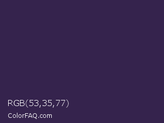 RGB 53,35,77 Color is a very dark violet color and the nearest color is Deep Grape #381a51. Hex code #35234d and RGB value is rgb(53,35,77). In RGB color space, this color is composed of 21% red, 14% green, 30% blue, In CMYK color space, this color is composed of 31% cyan, 55% magenta, 0% yellow , 70% black , In HSL color space, this color has a hue angle of 266° , 38% saturation and 22% lightness.