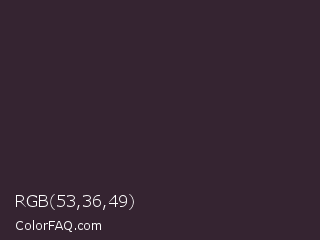 RGB 53,36,49 Color is a very dark magenta color and the nearest color is Thunder #33292f. Hex code #352431 and RGB value is rgb(53,36,49). In RGB color space, this color is composed of 21% red, 14% green, 19% blue, In CMYK color space, this color is composed of 0% cyan, 32% magenta, 8% yellow , 79% black , In HSL color space, this color has a hue angle of 314° , 19% saturation and 17% lightness.