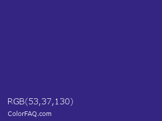 RGB 53,37,130 Color is a normal indigo color and the nearest color is Cosmic Cobalt #2e2d88. Hex code #352582 and RGB value is rgb(53,37,130). In RGB color space, this color is composed of 21% red, 15% green, 51% blue, In CMYK color space, this color is composed of 59% cyan, 72% magenta, 0% yellow , 49% black , In HSL color space, this color has a hue angle of 250° , 56% saturation and 33% lightness.