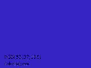 RGB 53,37,195 Color is a normal indigo color and the nearest color is Interdimensional Blue #360ccc. Hex code #3525c3 and RGB value is rgb(53,37,195). In RGB color space, this color is composed of 21% red, 15% green, 76% blue, In CMYK color space, this color is composed of 73% cyan, 81% magenta, 0% yellow , 24% black , In HSL color space, this color has a hue angle of 246° , 68% saturation and 45% lightness.