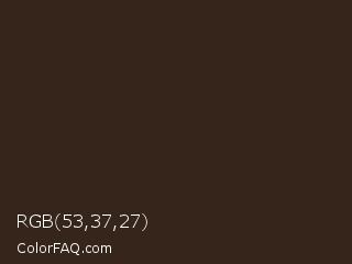 RGB 53,37,27 Color is a very dark orange color and the nearest color is Treehouse #3b2820. Hex code #35251b and RGB value is rgb(53,37,27). In RGB color space, this color is composed of 21% red, 15% green, 11% blue, In CMYK color space, this color is composed of 0% cyan, 30% magenta, 49% yellow , 79% black , In HSL color space, this color has a hue angle of 23° , 33% saturation and 16% lightness.