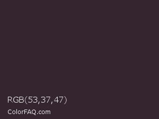 RGB 53,37,47 Color is a very dark magenta color and the nearest color is Thunder #33292f. Hex code #35252f and RGB value is rgb(53,37,47). In RGB color space, this color is composed of 21% red, 15% green, 18% blue, In CMYK color space, this color is composed of 0% cyan, 30% magenta, 11% yellow , 79% black , In HSL color space, this color has a hue angle of 323° , 18% saturation and 18% lightness.