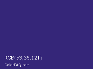 RGB 53,38,121 Color is a normal indigo color and the nearest color is Meteorite #3c1f76. Hex code #352679 and RGB value is rgb(53,38,121). In RGB color space, this color is composed of 21% red, 15% green, 47% blue, In CMYK color space, this color is composed of 56% cyan, 69% magenta, 0% yellow , 53% black , In HSL color space, this color has a hue angle of 251° , 52% saturation and 31% lightness.