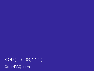 RGB 53,38,156 Color is a normal indigo color and the nearest color is Blue Pigment #333399. Hex code #35269c and RGB value is rgb(53,38,156). In RGB color space, this color is composed of 21% red, 15% green, 61% blue, In CMYK color space, this color is composed of 66% cyan, 76% magenta, 0% yellow , 39% black , In HSL color space, this color has a hue angle of 248° , 61% saturation and 38% lightness.