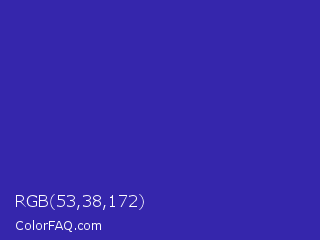 RGB 53,38,172 Color is a normal indigo color and the nearest color is Blue Pigment #333399. Hex code #3526ac and RGB value is rgb(53,38,172). In RGB color space, this color is composed of 21% red, 15% green, 67% blue, In CMYK color space, this color is composed of 69% cyan, 78% magenta, 0% yellow , 33% black , In HSL color space, this color has a hue angle of 247° , 64% saturation and 41% lightness.