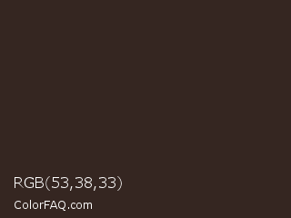 RGB 53,38,33 Color is a very dark color and the nearest color is Treehouse #3b2820. Hex code #352621 and RGB value is rgb(53,38,33). In RGB color space, this color is composed of 21% red, 15% green, 13% blue, In CMYK color space, this color is composed of 0% cyan, 28% magenta, 38% yellow , 79% black , In HSL color space, this color has a hue angle of 15° , 23% saturation and 17% lightness.