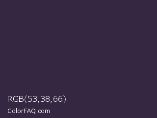 RGB 53,38,66 Color is a very dark purple color and the nearest color is Blackcurrant #32293a. Hex code #352642 and RGB value is rgb(53,38,66). In RGB color space, this color is composed of 21% red, 15% green, 26% blue, In CMYK color space, this color is composed of 20% cyan, 42% magenta, 0% yellow , 74% black , In HSL color space, this color has a hue angle of 272° , 27% saturation and 20% lightness.