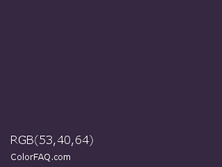 RGB 53,40,64 Color is a very dark purple color and the nearest color is Blackcurrant #32293a. Hex code #352840 and RGB value is rgb(53,40,64). In RGB color space, this color is composed of 21% red, 16% green, 25% blue, In CMYK color space, this color is composed of 17% cyan, 38% magenta, 0% yellow , 75% black , In HSL color space, this color has a hue angle of 273° , 23% saturation and 20% lightness.