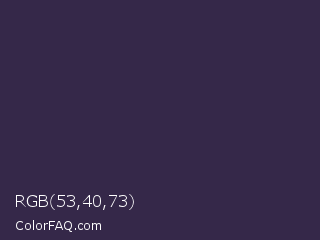 RGB 53,40,73 Color is a very dark violet color and the nearest color is Martinique #363050. Hex code #352849 and RGB value is rgb(53,40,73). In RGB color space, this color is composed of 21% red, 16% green, 29% blue, In CMYK color space, this color is composed of 27% cyan, 45% magenta, 0% yellow , 71% black , In HSL color space, this color has a hue angle of 264° , 29% saturation and 22% lightness.