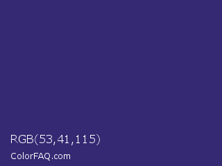 RGB 53,41,115 Color is a normal indigo color and the nearest color is Jacarta #3a2a6a. Hex code #352973 and RGB value is rgb(53,41,115). In RGB color space, this color is composed of 21% red, 16% green, 45% blue, In CMYK color space, this color is composed of 54% cyan, 64% magenta, 0% yellow , 55% black , In HSL color space, this color has a hue angle of 250° , 47% saturation and 31% lightness.