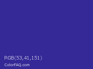 RGB 53,41,151 Color is a normal indigo color and the nearest color is Blue Pigment #333399. Hex code #352997 and RGB value is rgb(53,41,151). In RGB color space, this color is composed of 21% red, 16% green, 59% blue, In CMYK color space, this color is composed of 65% cyan, 73% magenta, 0% yellow , 41% black , In HSL color space, this color has a hue angle of 247° , 57% saturation and 38% lightness.