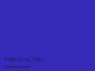 RGB 53,41,186 Color is a normal indigo color and the nearest color is Governor Bay #2f3cb3. Hex code #3529ba and RGB value is rgb(53,41,186). In RGB color space, this color is composed of 21% red, 16% green, 73% blue, In CMYK color space, this color is composed of 72% cyan, 78% magenta, 0% yellow , 27% black , In HSL color space, this color has a hue angle of 245° , 64% saturation and 45% lightness.