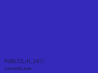 RGB 53,41,187 Color is a normal indigo color and the nearest color is Governor Bay #2f3cb3. Hex code #3529bb and RGB value is rgb(53,41,187). In RGB color space, this color is composed of 21% red, 16% green, 73% blue, In CMYK color space, this color is composed of 72% cyan, 78% magenta, 0% yellow , 27% black , In HSL color space, this color has a hue angle of 245° , 64% saturation and 45% lightness.