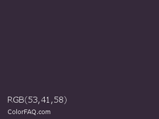 RGB 53,41,58 Color is a very dark purple color and the nearest color is Blackcurrant #32293a. Hex code #35293a and RGB value is rgb(53,41,58). In RGB color space, this color is composed of 21% red, 16% green, 23% blue, In CMYK color space, this color is composed of 9% cyan, 29% magenta, 0% yellow , 77% black , In HSL color space, this color has a hue angle of 282° , 17% saturation and 19% lightness.