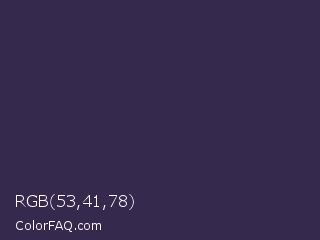 RGB 53,41,78 Color is a dark indigo color and the nearest color is Martinique #363050. Hex code #35294e and RGB value is rgb(53,41,78). In RGB color space, this color is composed of 21% red, 16% green, 31% blue, In CMYK color space, this color is composed of 32% cyan, 47% magenta, 0% yellow , 69% black , In HSL color space, this color has a hue angle of 259° , 31% saturation and 23% lightness.