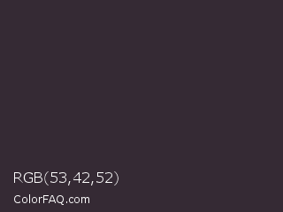 RGB 53,42,52 Color is a very dark magenta color and the nearest color is Thunder #33292f. Hex code #352a34 and RGB value is rgb(53,42,52). In RGB color space, this color is composed of 21% red, 16% green, 20% blue, In CMYK color space, this color is composed of 0% cyan, 21% magenta, 2% yellow , 79% black , In HSL color space, this color has a hue angle of 305° , 12% saturation and 19% lightness.