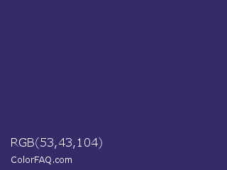 RGB 53,43,104 Color is a dark indigo color and the nearest color is Jacarta #3a2a6a. Hex code #352b68 and RGB value is rgb(53,43,104). In RGB color space, this color is composed of 21% red, 17% green, 41% blue, In CMYK color space, this color is composed of 49% cyan, 59% magenta, 0% yellow , 59% black , In HSL color space, this color has a hue angle of 250° , 41% saturation and 29% lightness.