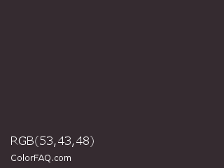 RGB 53,43,48 Color is a very dark rose color and the nearest color is Thunder #33292f. Hex code #352b30 and RGB value is rgb(53,43,48). In RGB color space, this color is composed of 21% red, 17% green, 19% blue, In CMYK color space, this color is composed of 0% cyan, 19% magenta, 9% yellow , 79% black , In HSL color space, this color has a hue angle of 330° , 10% saturation and 19% lightness.