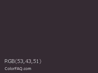RGB 53,43,51 Color is a very dark magenta color and the nearest color is Thunder #33292f. Hex code #352b33 and RGB value is rgb(53,43,51). In RGB color space, this color is composed of 21% red, 17% green, 20% blue, In CMYK color space, this color is composed of 0% cyan, 19% magenta, 4% yellow , 79% black , In HSL color space, this color has a hue angle of 312° , 10% saturation and 19% lightness.