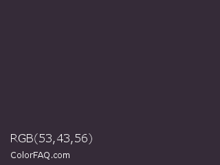 RGB 53,43,56 Color is a very dark purple color and the nearest color is Blackcurrant #32293a. Hex code #352b38 and RGB value is rgb(53,43,56). In RGB color space, this color is composed of 21% red, 17% green, 22% blue, In CMYK color space, this color is composed of 5% cyan, 23% magenta, 0% yellow , 78% black , In HSL color space, this color has a hue angle of 286° , 13% saturation and 19% lightness.